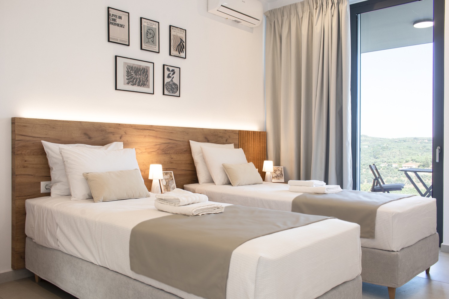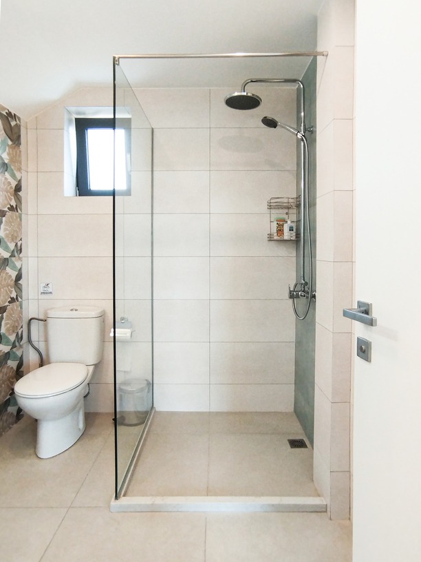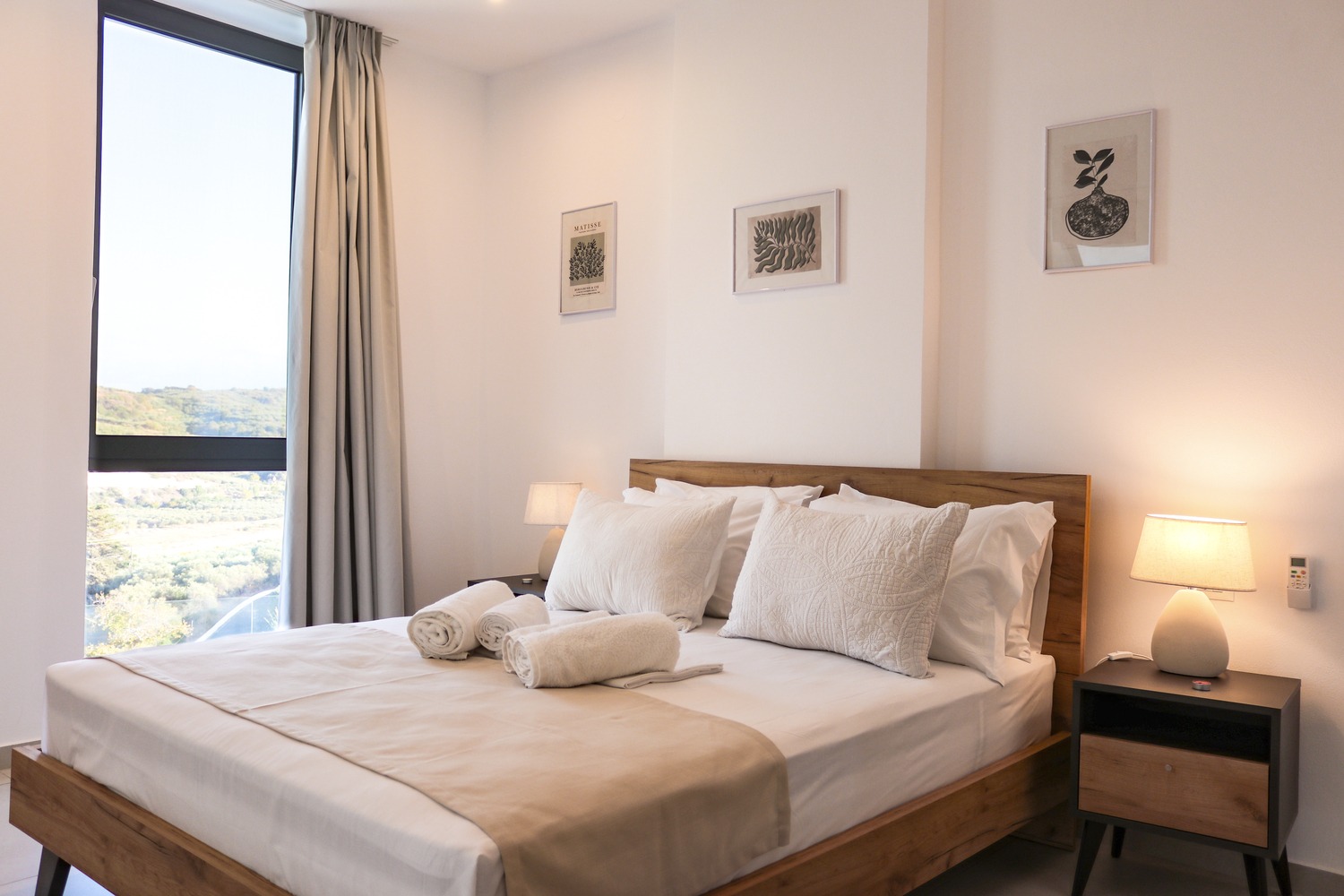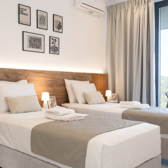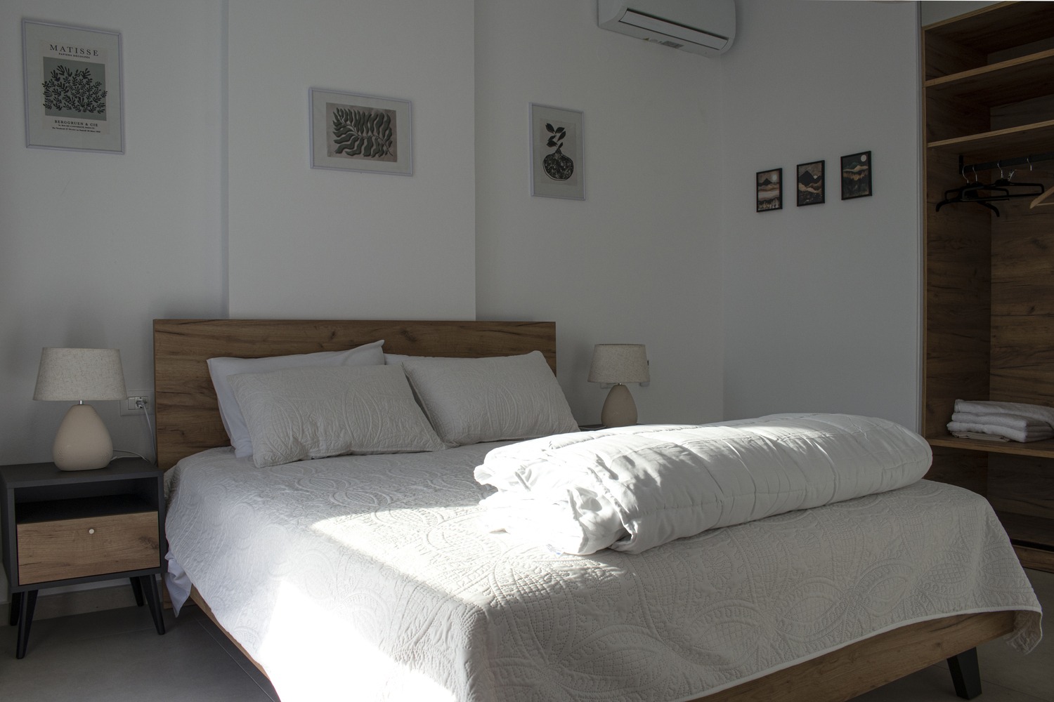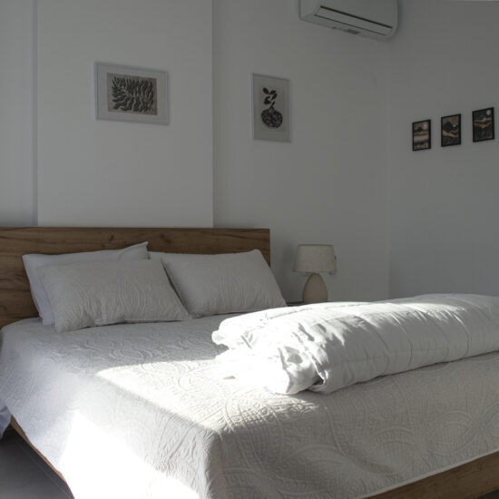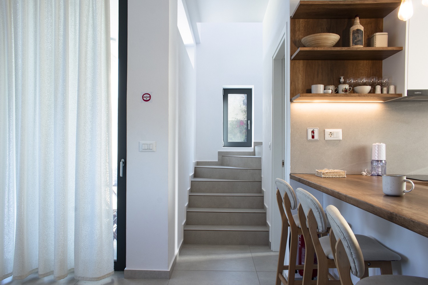 It is an 90 square meters. two-storey apartment, decorated in cream tones. The ground floor consists of a spacious living room, with a couch that can host an adult or 2 children, a dining room and a kitchen as well as a bathroom. On the first floor you may find the second bathroom as well as the two bedrooms. One bedroom provides a double bed while the other two comfortable singles that can be double, depending on the preferences of the guests. The bedrooms communicate with a common balcony, ideal for enjoying the view together.