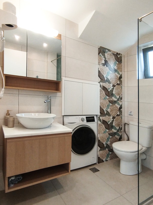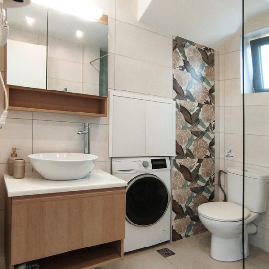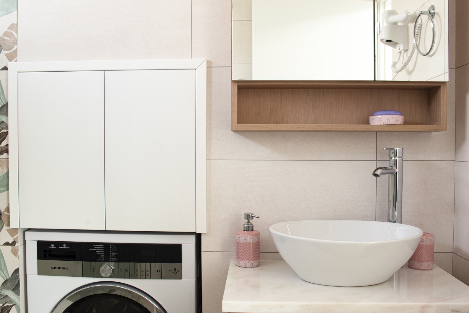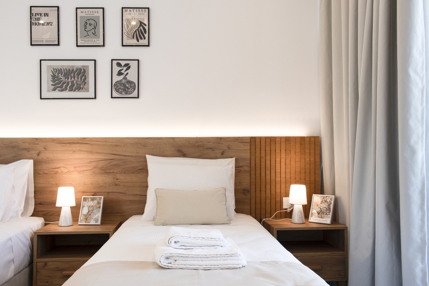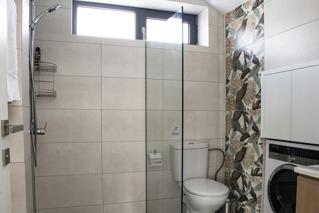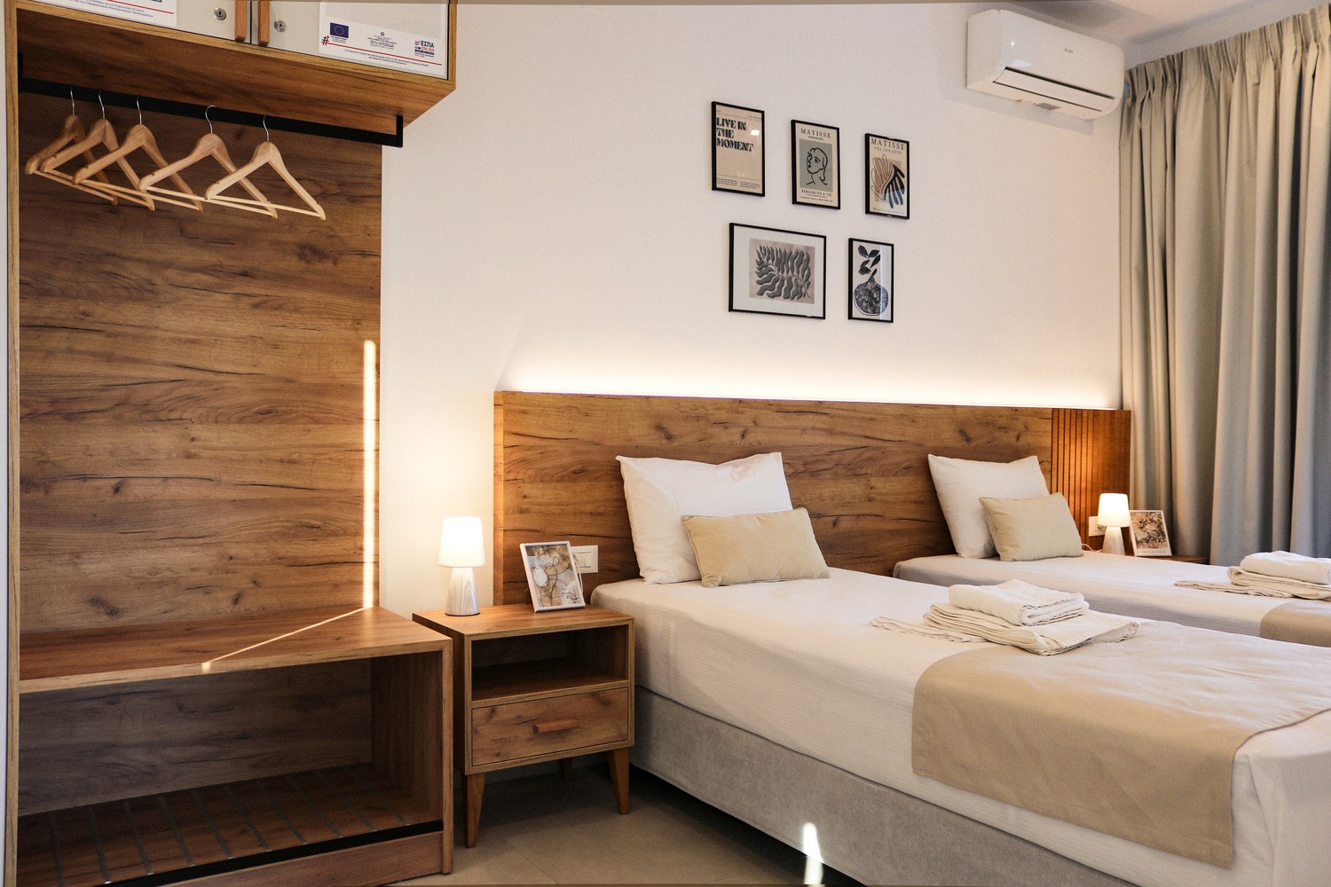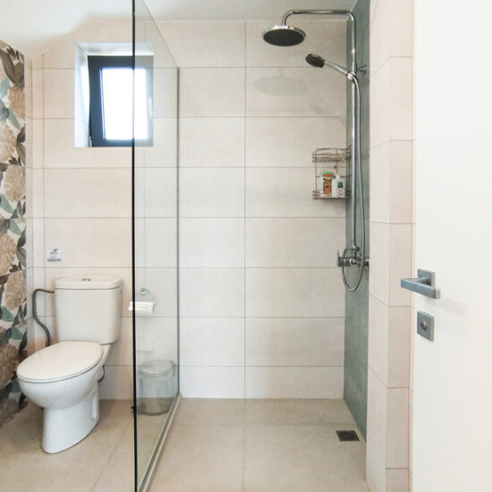 It is an 90 square meters. two-storey apartment, decorated in cream tones. The ground floor consists of a spacious living room, with a couch that can host an adult or 2 children, a dining room and a kitchen as well as a bathroom. On the first floor you may find the second bathroom as well as the two bedrooms. One bedroom provides a double bed while the other two comfortable singles that can be double, depending on the preferences of the guests. The bedrooms communicate with a common balcony, ideal for enjoying the view together.