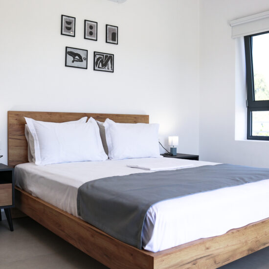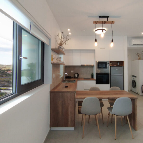 It is 60 square meters and it consists of a spacious living room with a double sofa that becomes a double bed with satelite television, a kitchen, a bathroom and a bedroom with a double bed.